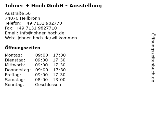 4 Albrecht Ott Ingenieurbüro für Hoch- und Tiefbau (Entfernung: 4,41 km) Friedhofstr. 16, 74172 Neckarsulm 5 G. Pfistert und Co. Hoch- Tief- und Straßenbau (Entfernung: 5,88 km) Amsterdamer Str. 15, 74081 Heilbronn 6 Heidinger ( Sanitär - Heizung ) Ausstellung (Entfernung: 7,99 km) Poststr. 2, 74177 Bad Friedrichshall-Jagstfeld |