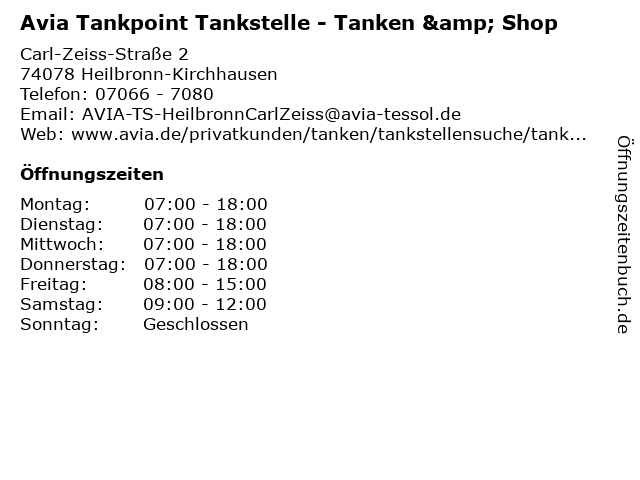 1 Avia Tankpoint Tankstelle - Waschanlage (Entfernung: 0,00 km) Carl-Zeiss-Straße 2, 74078 Heilbronn-Kirchhausen 6 |