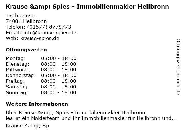 1 Thomas Flom Versicherungs- und Immobilienmakler (Entfernung: 0,94 km) Hellmuth-Hirth-Str. 1, 74081 Heilbronn 4 Mitwohnzentrale Plieninger-Hauschild Christina Immobilienmakler (Entfernung: 7,44 km) Salinenstr. 39, 74172 Neckarsulm 5 Klaus-Peter Dambach - Immobilienmakler Immobilienmakler (Entfernung: 11,66 km) Carl-Benz-Str. 8, 71717 Beilstein 6 |