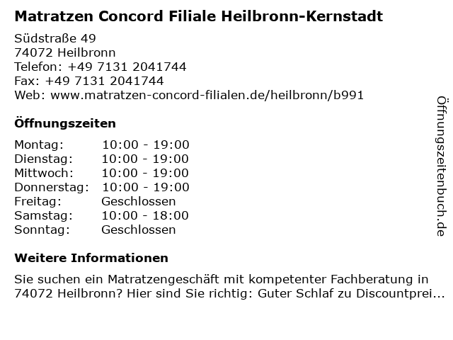 2 Aktuell Lohnsteuerhilfeverein e.V. - Heilbronn Kernstadt (Entfernung: 1,91 km) Hundsbergstr. 31, 74076 Heilbronn 3 Matratzen Concord Filiale Heilbronn-Böckingen (Entfernung: 2,27 km) Neckargartacher Straße 110, 74080 Heilbronn 6 |