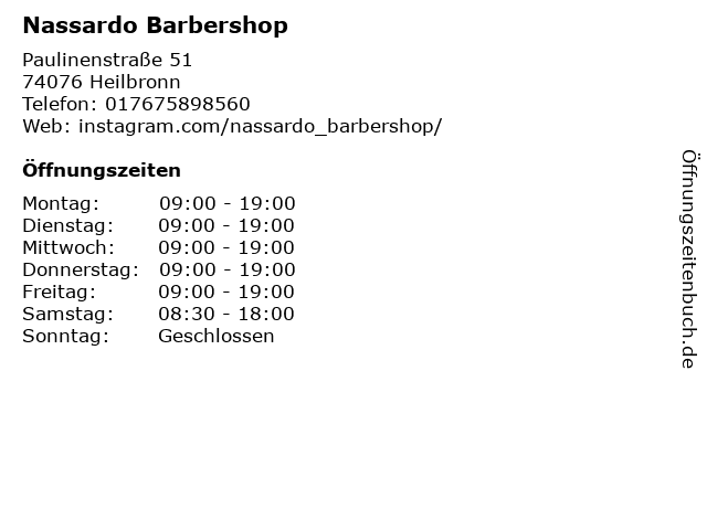 | Öffnungszeiten Nassardo Barbershop in Heilbronn anzeigen | |