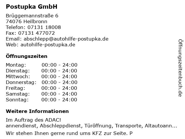 1 Postupka GmbH - Filiale Heilbronn (Abschleppdienst) (Entfernung: 0,00 km) Brüggemannstraße 6, 74076 Heilbronn |