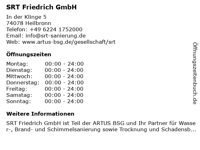| Öffnungszeiten SRT Friedrich GmbH in Heilbronn anzeigen | |