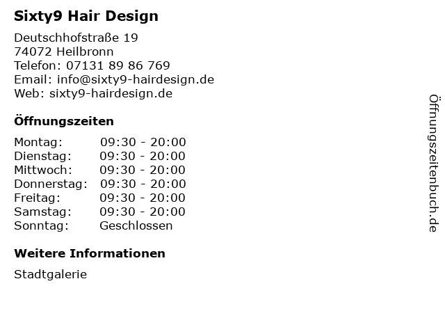 | Öffnungszeiten Sixty9 Hair Design in Heilbronn anzeigen | |