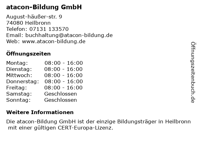 | Öffnungszeiten atacon-Bildung GmbH in Heilbronn anzeigen | |