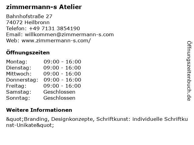 | Öffnungszeiten zimmermann-s Atelier in Heilbronn anzeigen | |