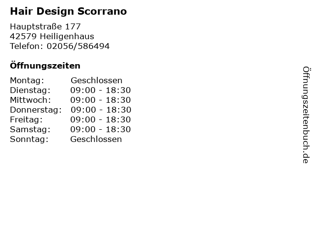 | Öffnungszeiten Hair Design Scorrano in Heiligenhaus anzeigen | |