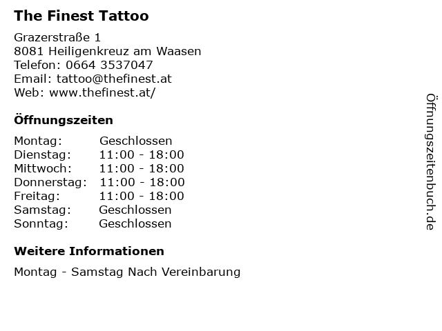 1 Piccadilly The old English Café Pub (Entfernung: 8,55 km) St. Georgen 15, 8413 St. Georgen an der Stiefing 3 Right In Ink - Tattoo - Piercing - Permanent Make-Up - Kalsdorf (Entfernung: 10,13 km) Industriezeile 1, Objekt Nr 8, 8401 Graz 6 |