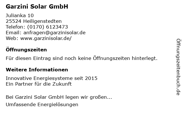 | Öffnungszeiten Garzini Solar GmbH in Heiligenstedten anzeigen | |