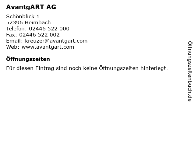 | Öffnungszeiten AvantgART AG in Heimbach anzeigen | |