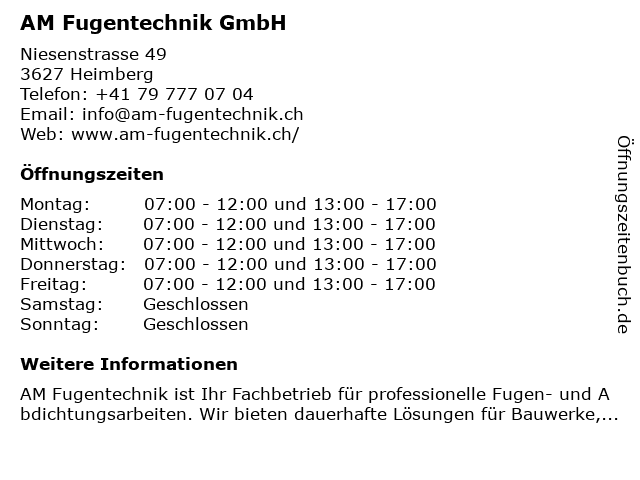 | Öffnungszeiten AM Fugentechnik GmbH in Heimberg anzeigen | |