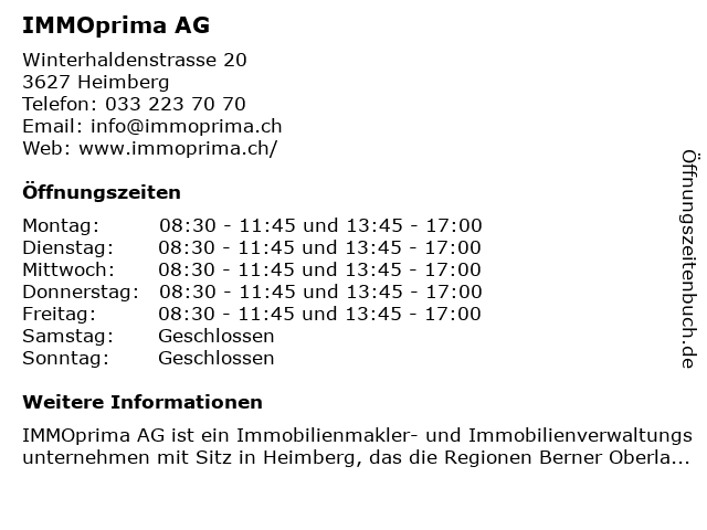 | Öffnungszeiten IMMOprima AG in Heimberg anzeigen | |