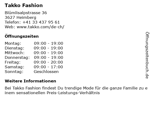 | Öffnungszeiten Takko Fashion in Heimberg anzeigen | |
