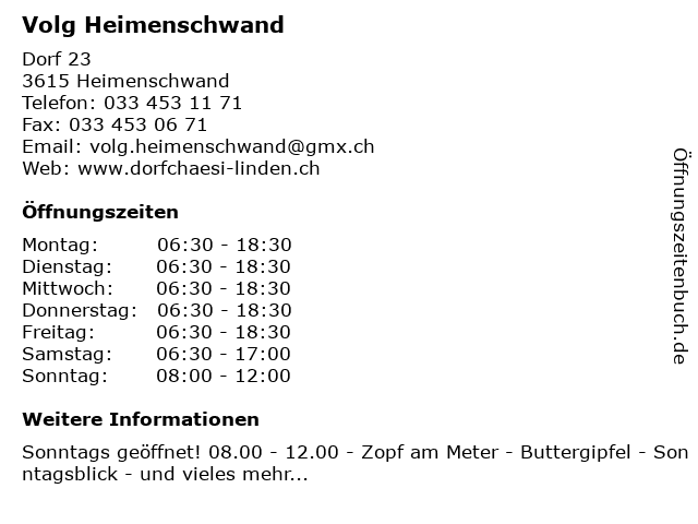 | Öffnungszeiten Volg Heimenschwand in Heimenschwand anzeigen | |