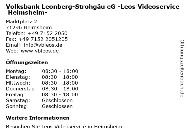 2 3 Volksbank Leonberg-Strohgäu eG -Geschäftsstelle Friolzheim- (Entfernung: 3,97 km) Rathausstraße 1, 71292 Friolzheim 4 Volksbank Leonberg-Strohgäu eG -Geschäftsstelle Flacht- (Entfernung: 4,92 km) Leonberger Straße 7, 71287 Weissach 5 Volksbank Leonberg-Strohgäu eG (Geldautomat) (Entfernung: 4,92 km) Leonberger Straße 7, 71287 Weissach-Flacht 6 Volksbank Leonberg-Strohgäu eG -Geschäftsstelle Rutesheim- (Entfernung: 6,14 km) Leonberger Straße 2-6, 71277 Rutesheim |