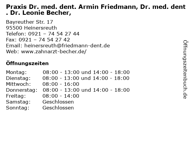Branchen & Suchbegriffe zu Praxis Dr. med. dent. Armin Friedmann, Dr. med. dent. Dr. Leonie Becher,:armin, becher, dent., dr., friedmann, gesundheit, leonie, med., praxis, zahnarzt, zahnarztpraxis, zahnheilkunde |