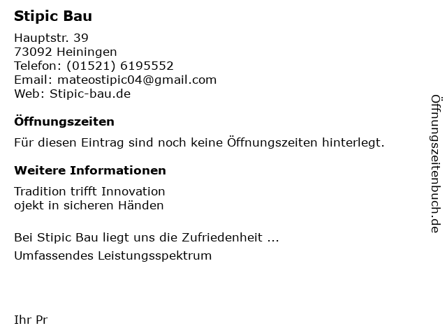 | Öffnungszeiten Stipic Bau in Heiningen anzeigen | |