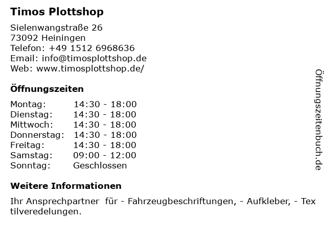 | Öffnungszeiten Timos Plottshop in Heiningen anzeigen | |