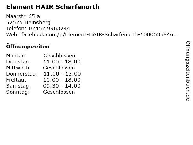 | Öffnungszeiten Element HAIR Scharfenorth in Heinsberg anzeigen | |