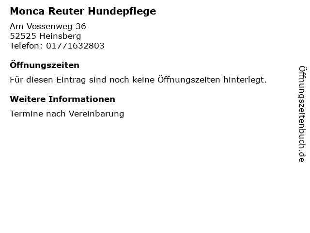 | Öffnungszeiten Monca Reuter Hundepflege in Heinsberg anzeigen | |