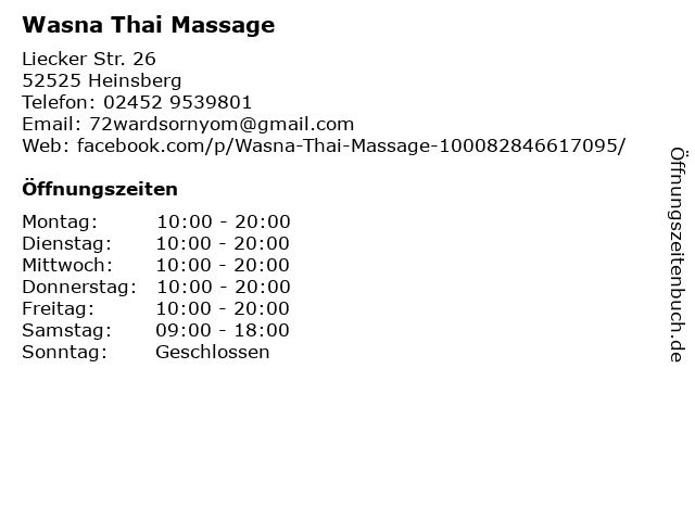 | Öffnungszeiten Wasna Thai Massage in Heinsberg anzeigen | |