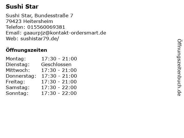 | Öffnungszeiten Sushi Star in Heitersheim anzeigen | |