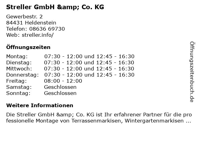 | Öffnungszeiten Streller GmbH & Co. KG in Heldenstein anzeigen | |
