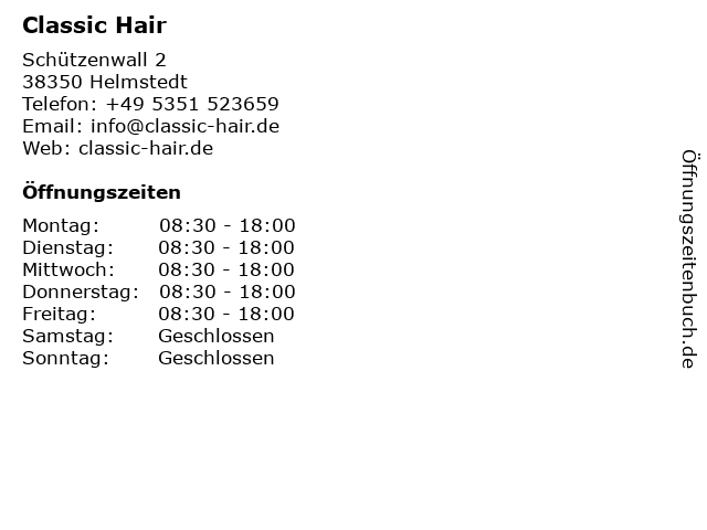| Öffnungszeiten Classic Hair in Helmstedt anzeigen | |