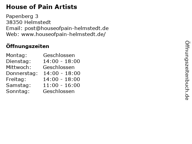 | Öffnungszeiten House of Pain Artists in Helmstedt anzeigen | |