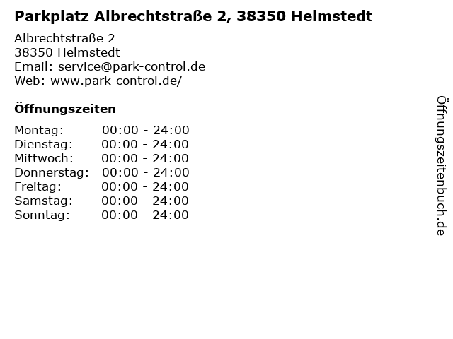 | Öffnungszeiten Parkplatz Albrechtstraße 2, 38350 Helmstedt in Helmstedt anzeigen | |