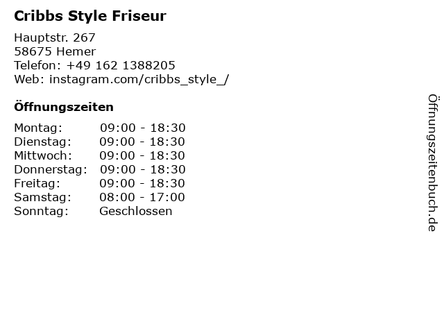 | Öffnungszeiten Cribbs Style Friseur in Hemer anzeigen | |