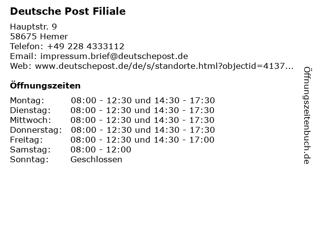 Öffnungszeiten Deutsche Post Filiale in Hemer anzeigen | |