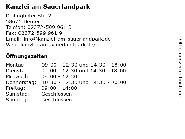 | Öffnungszeiten Kanzlei am Sauerlandpark in Hemer anzeigen | |