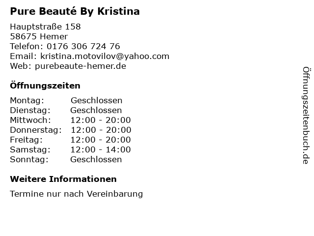 | Öffnungszeiten Pure Beauté By Kristina in Hemer anzeigen | |