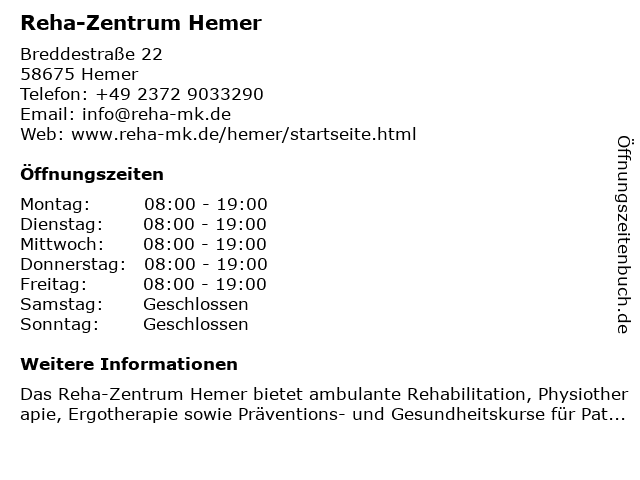 | Öffnungszeiten Reha-Zentrum Hemer in Hemer anzeigen | |