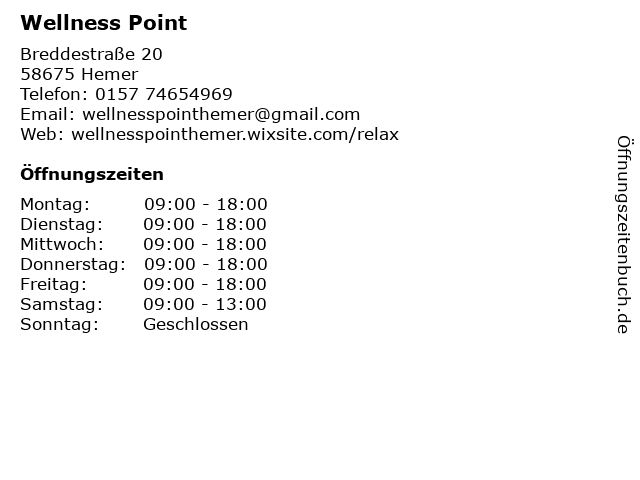 | Öffnungszeiten Wellness Point in Hemer anzeigen | |
