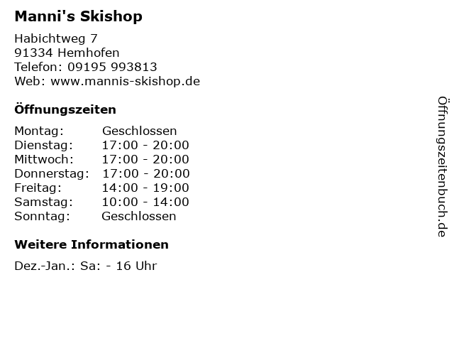 | Öffnungszeiten Manni's Skishop in Hemhofen anzeigen | |