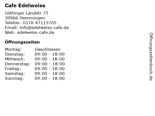 | Öffnungszeiten Cafe Edelweiss in Hemmingen anzeigen | |