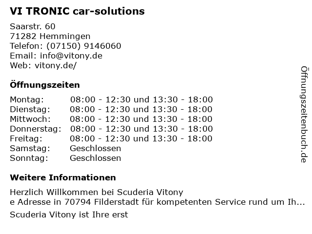 | Öffnungszeiten VI TRONIC car-solutions in Hemmingen anzeigen | |