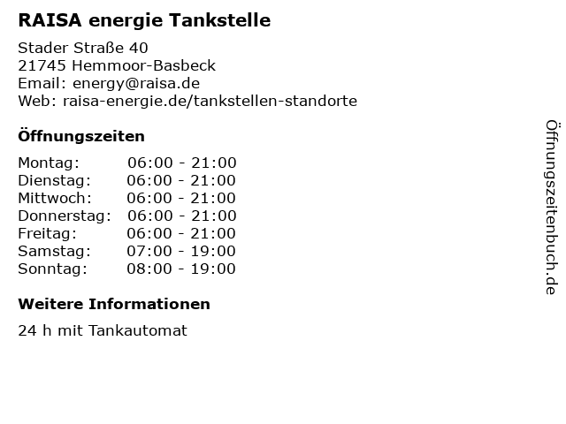 | Öffnungszeiten RAISA energie Tankstelle in Hemmoor-Basbeck anzeigen | |