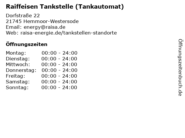 | Öffnungszeiten Raiffeisen Tankstelle (Tankautomat) in Hemmoor-Westersode anzeigen | |