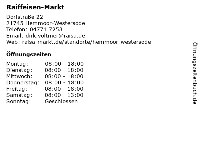| Öffnungszeiten Raiffeisen-Markt in Hemmoor-Westersode anzeigen | |