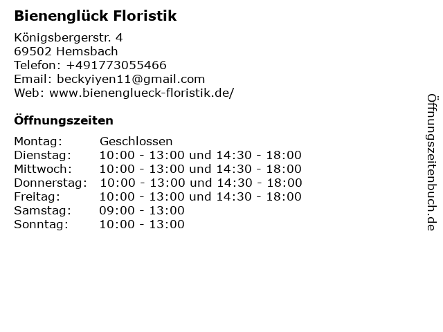 | Öffnungszeiten Bienenglück Floristik in Hemsbach anzeigen | |