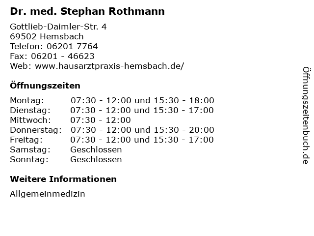 | Öffnungszeiten Dr. med. Stephan Rothmann in Hemsbach anzeigen | |