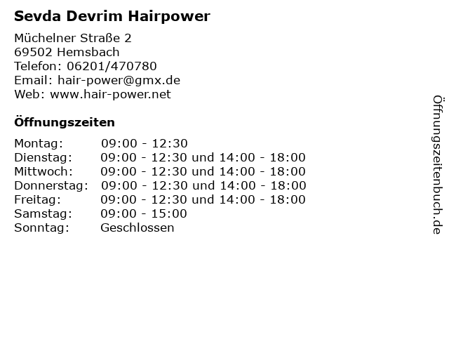 | Öffnungszeiten Sevda Devrim Hairpower in Hemsbach anzeigen | |