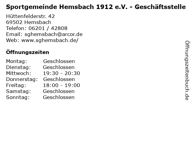 Branchen & Suchbegriffe zu Sportgemeinde Hemsbach 1912 e.V. - Geschäftsstelle:1912, e., e.v., geschäftsstelle, sportgemeinde, v. |