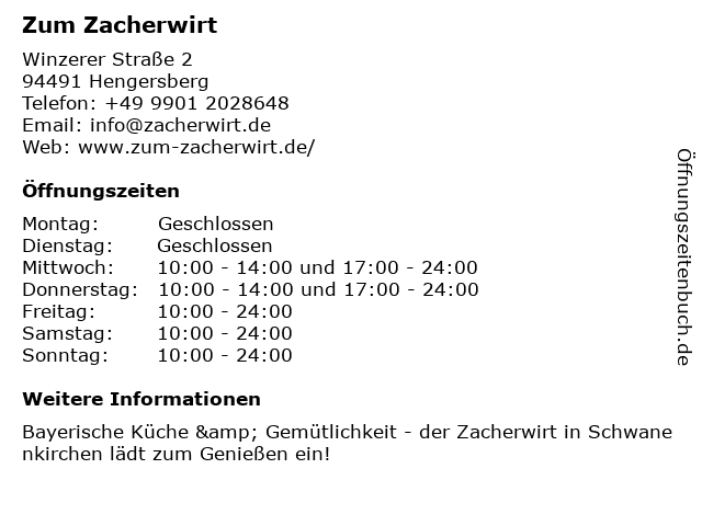 | Öffnungszeiten Zum Zacherwirt in Hengersberg anzeigen | |