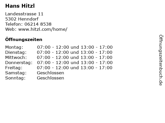 | Öffnungszeiten Hans Hitzl in Henndorf anzeigen | |