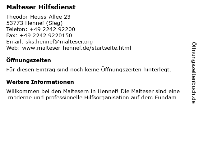 | Öffnungszeiten Malteser Hilfsdienst in Hennef (Sieg) anzeigen | |