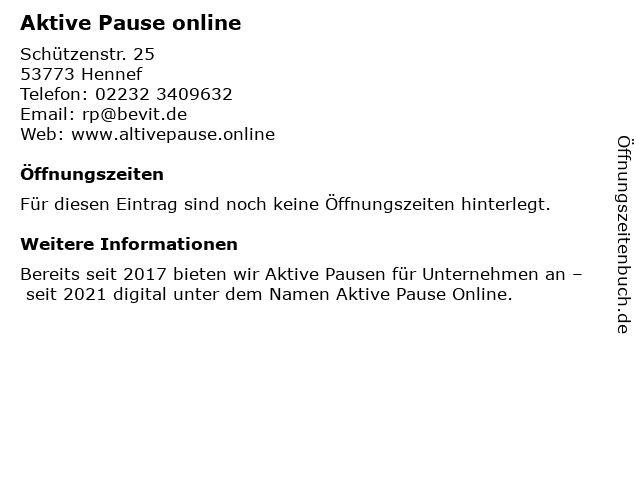 | Öffnungszeiten Aktive Pause online in Hennef anzeigen | |